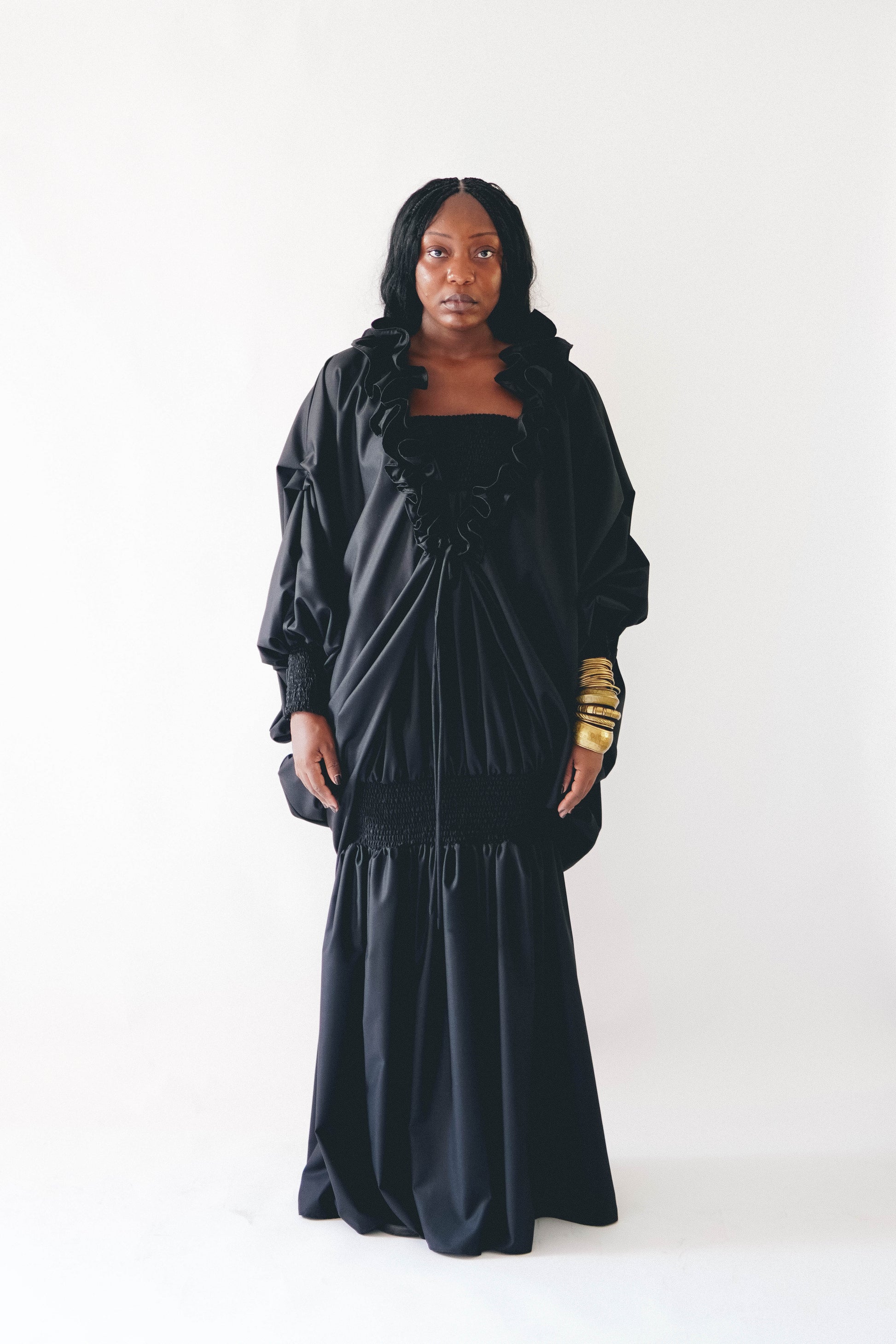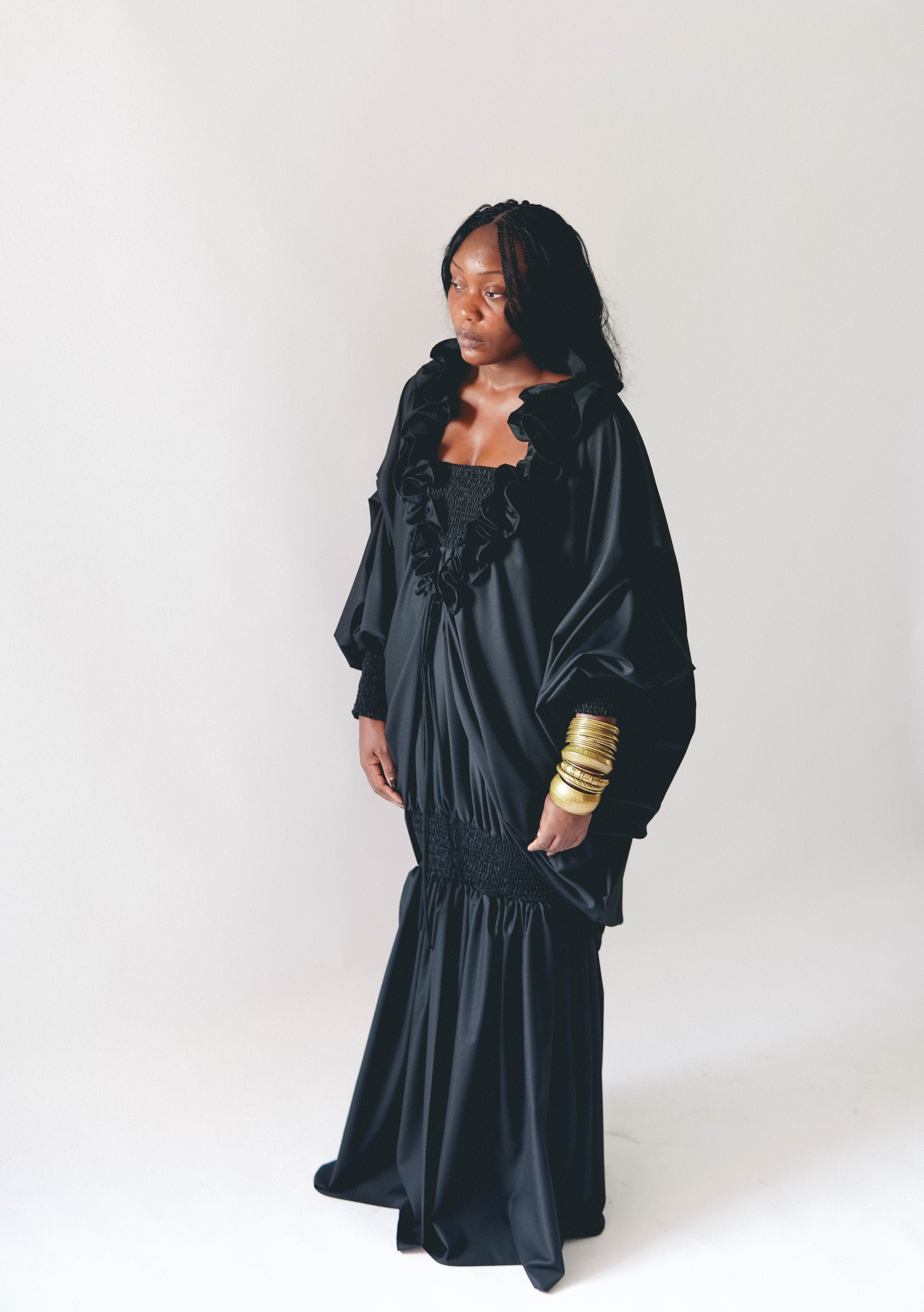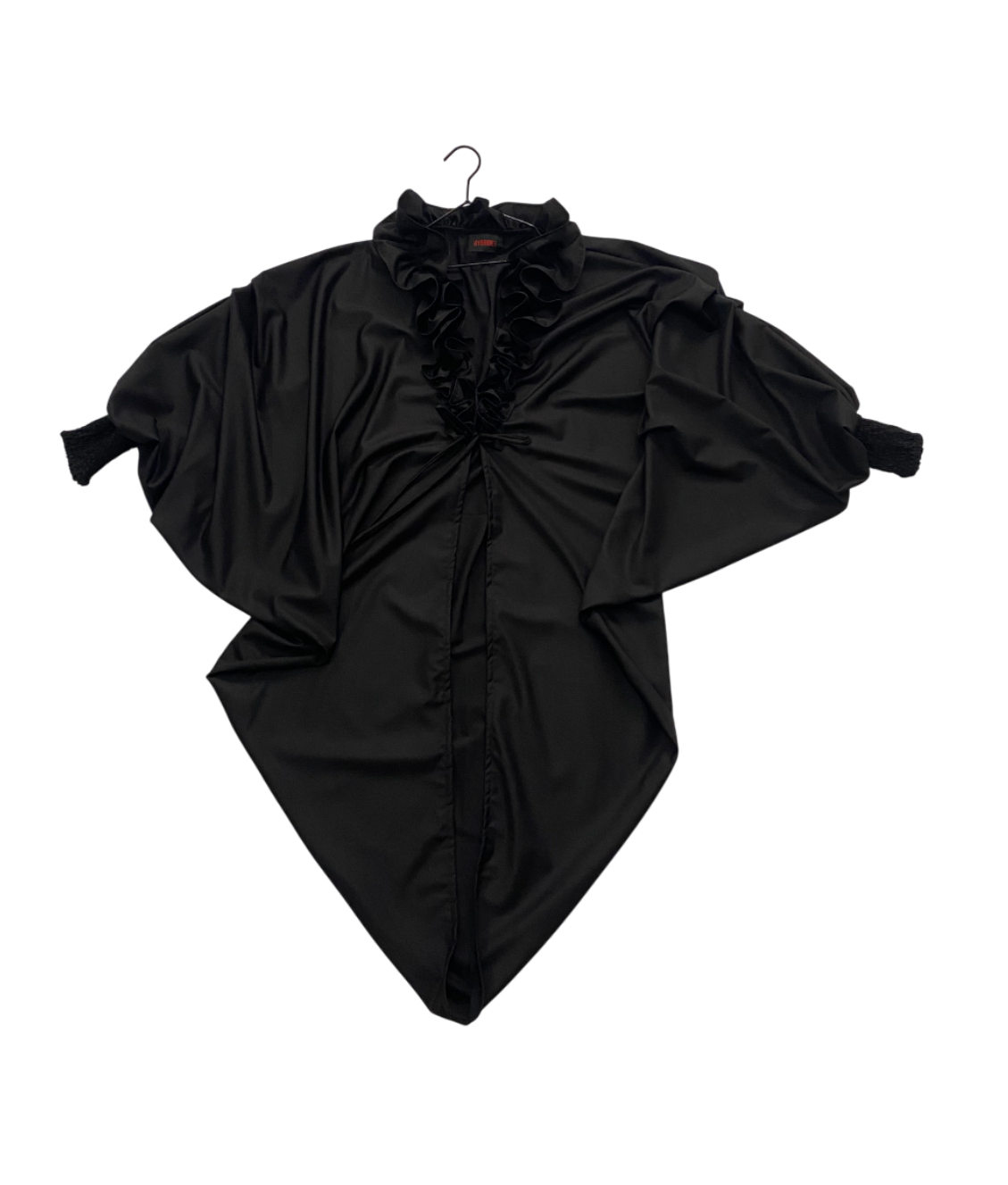 Lightweight jacket with batwing sleeves and gathered collar details. Mid-length.