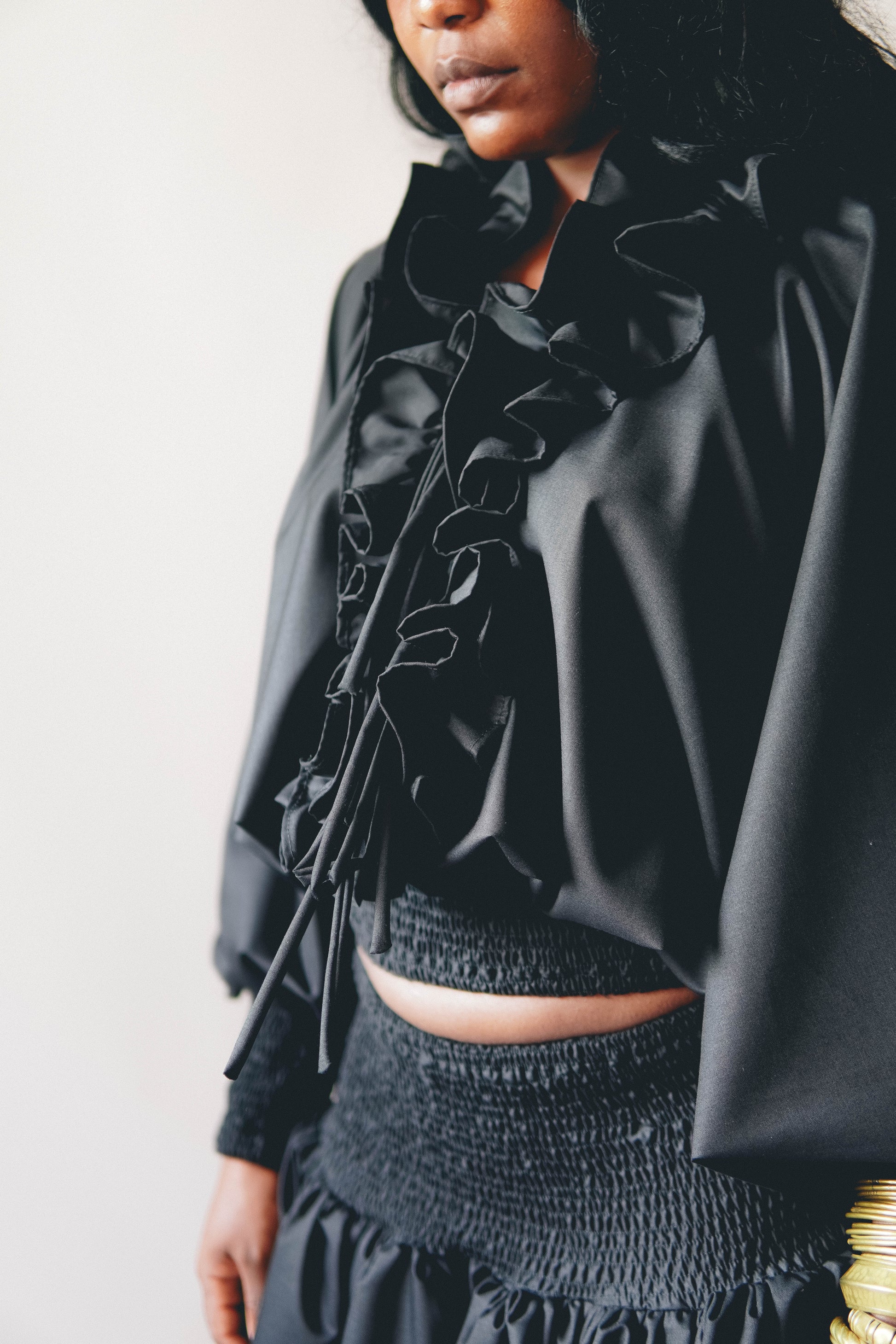 Camisole featuring a plunging neckline, puff sleeves, and a smocked waist.